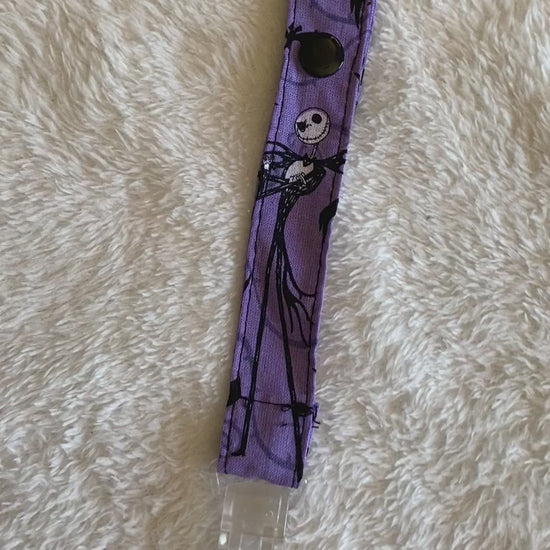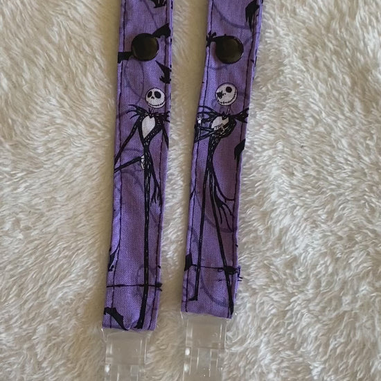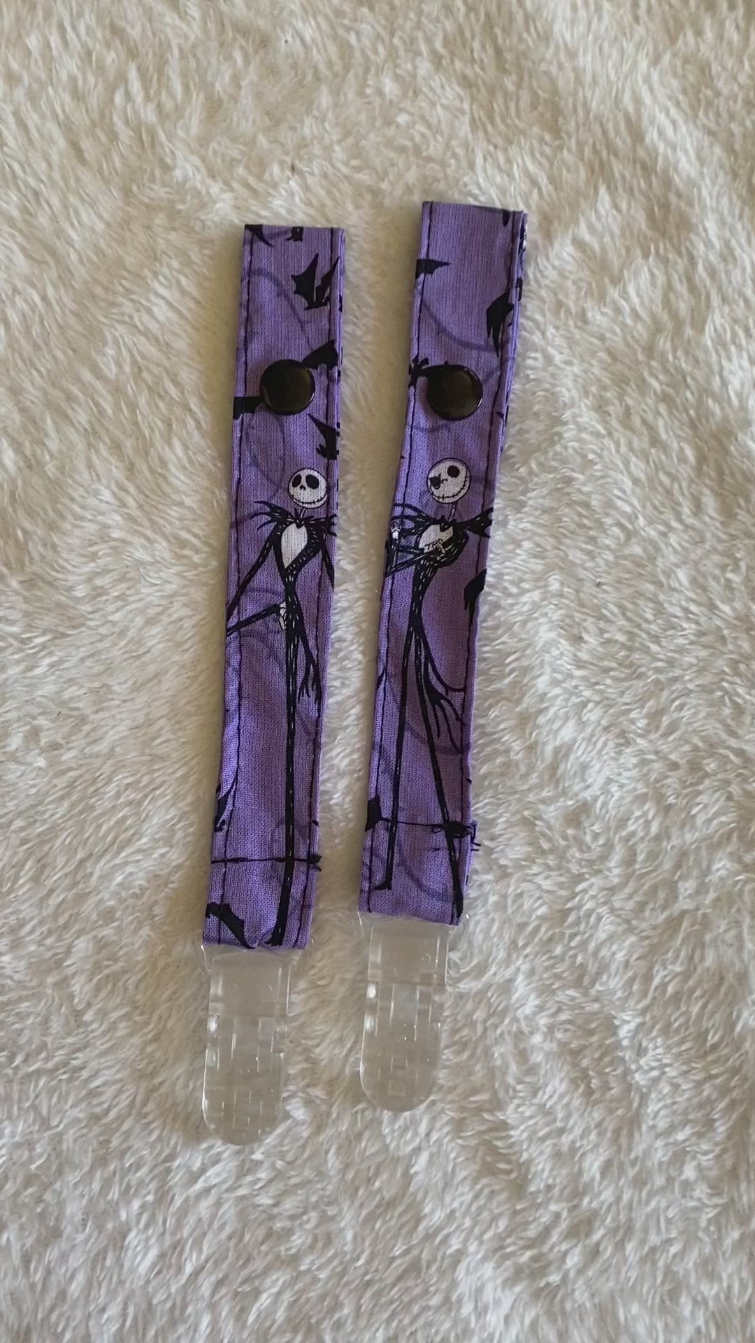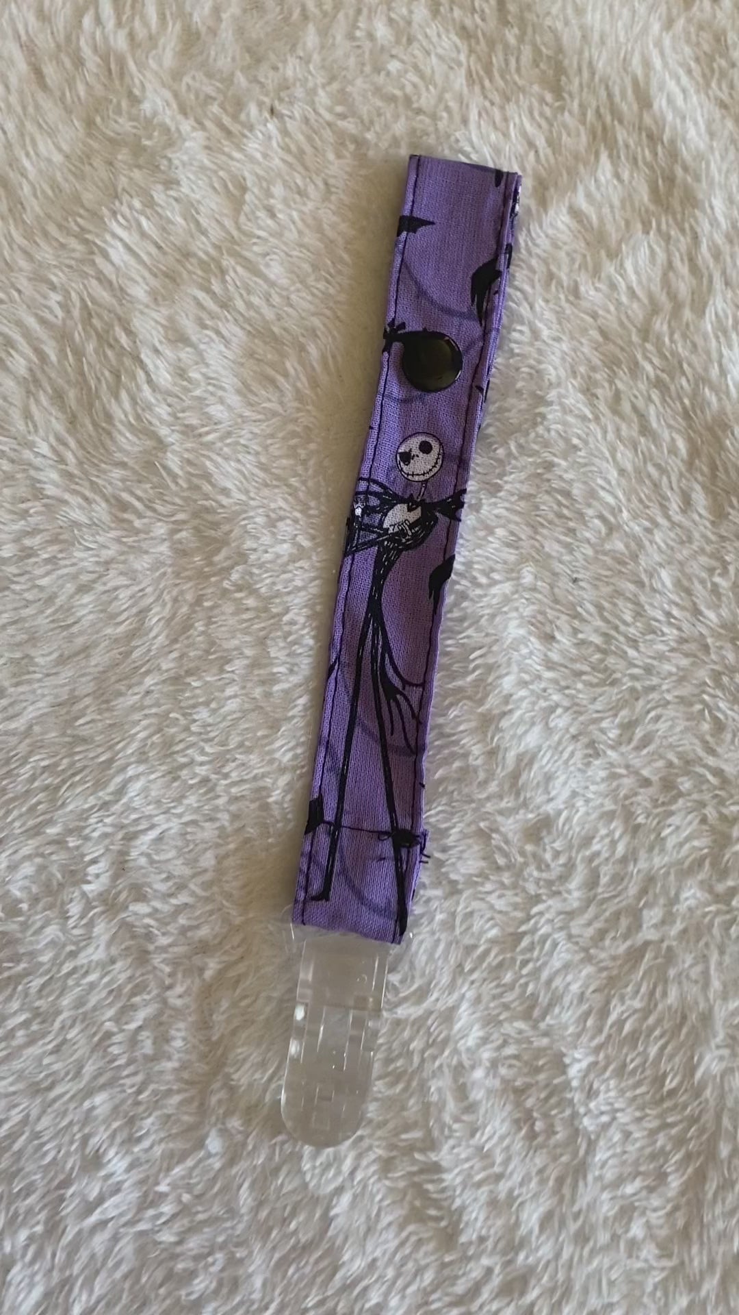 This Purple with Jack standing print cotton 8" length clip Works with Pacifiers of many different kinds and toys as well.