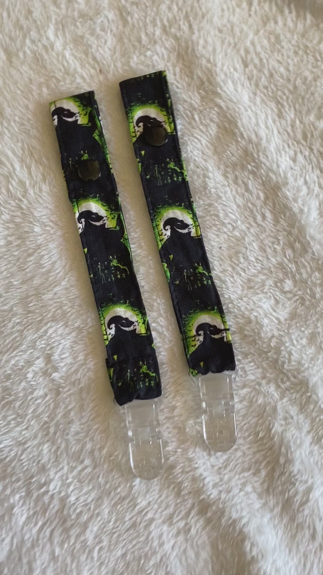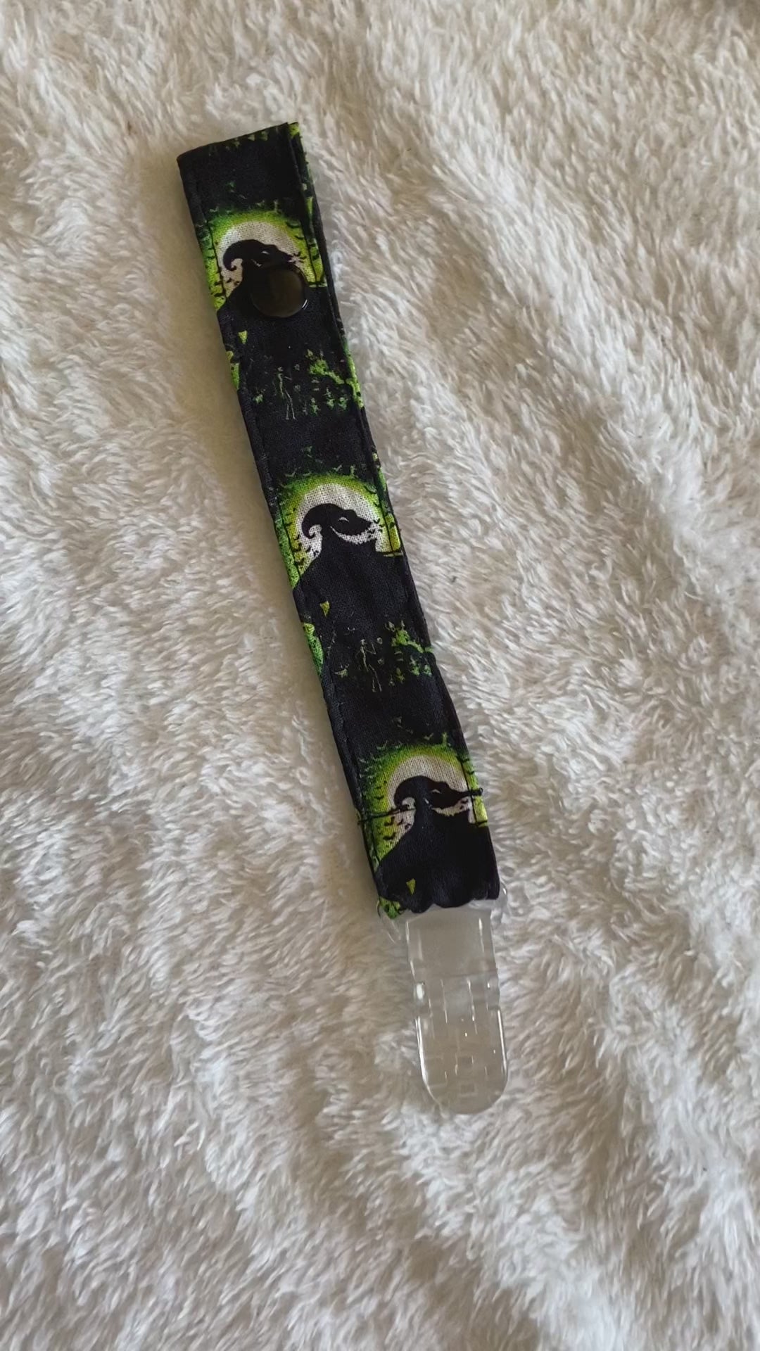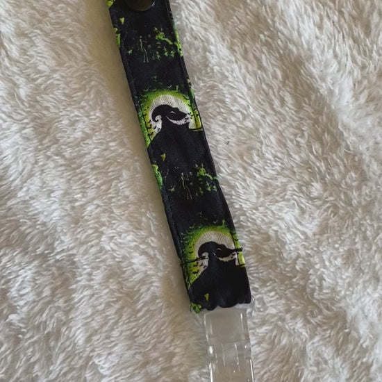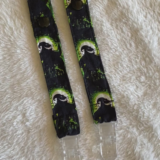 This Black and green oogie boogie print cotton 8" length clip Works with Pacifiers of many different kinds and toys as well.