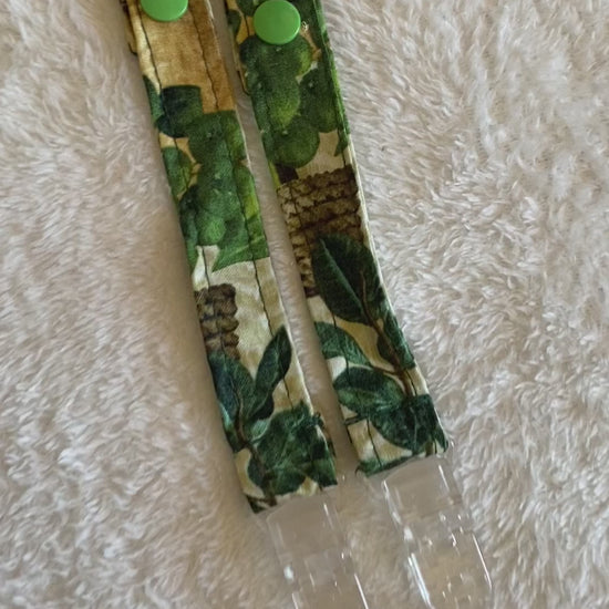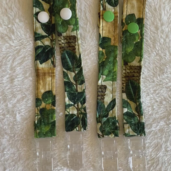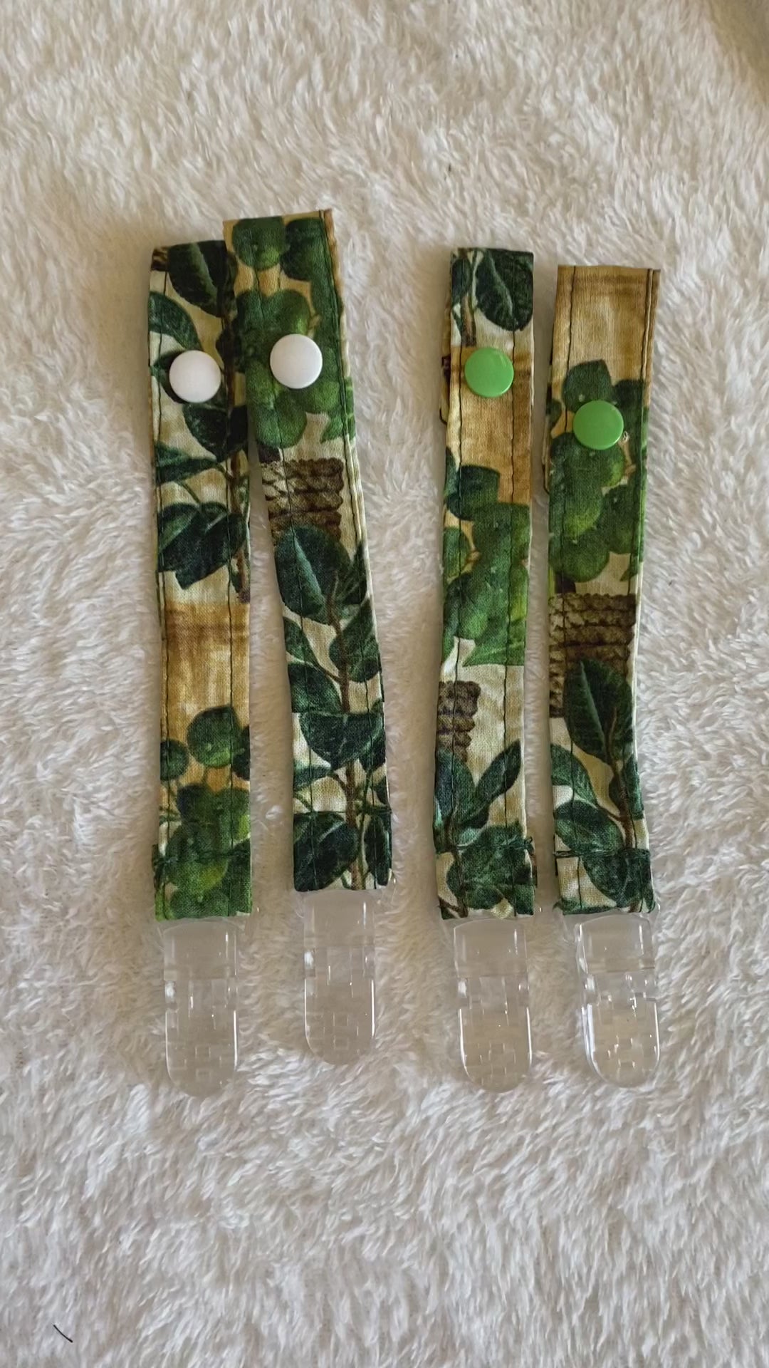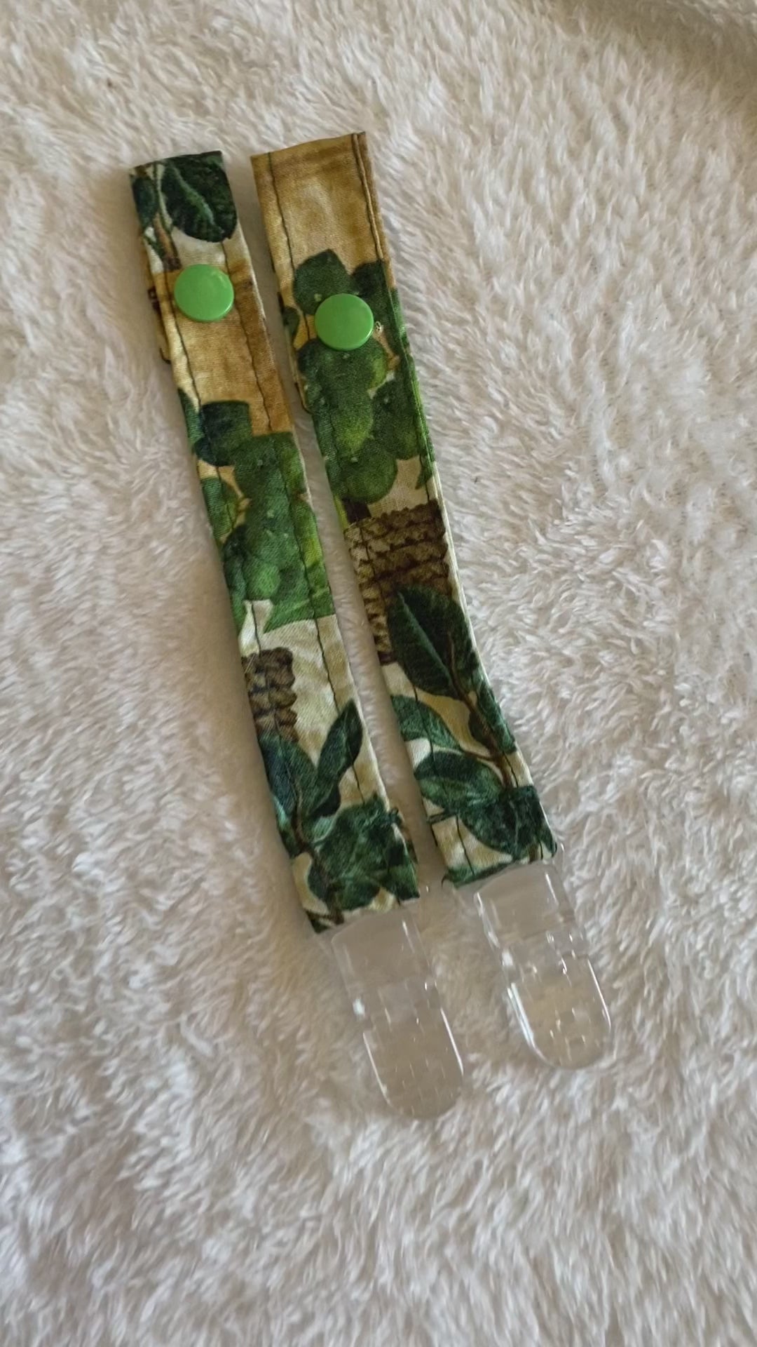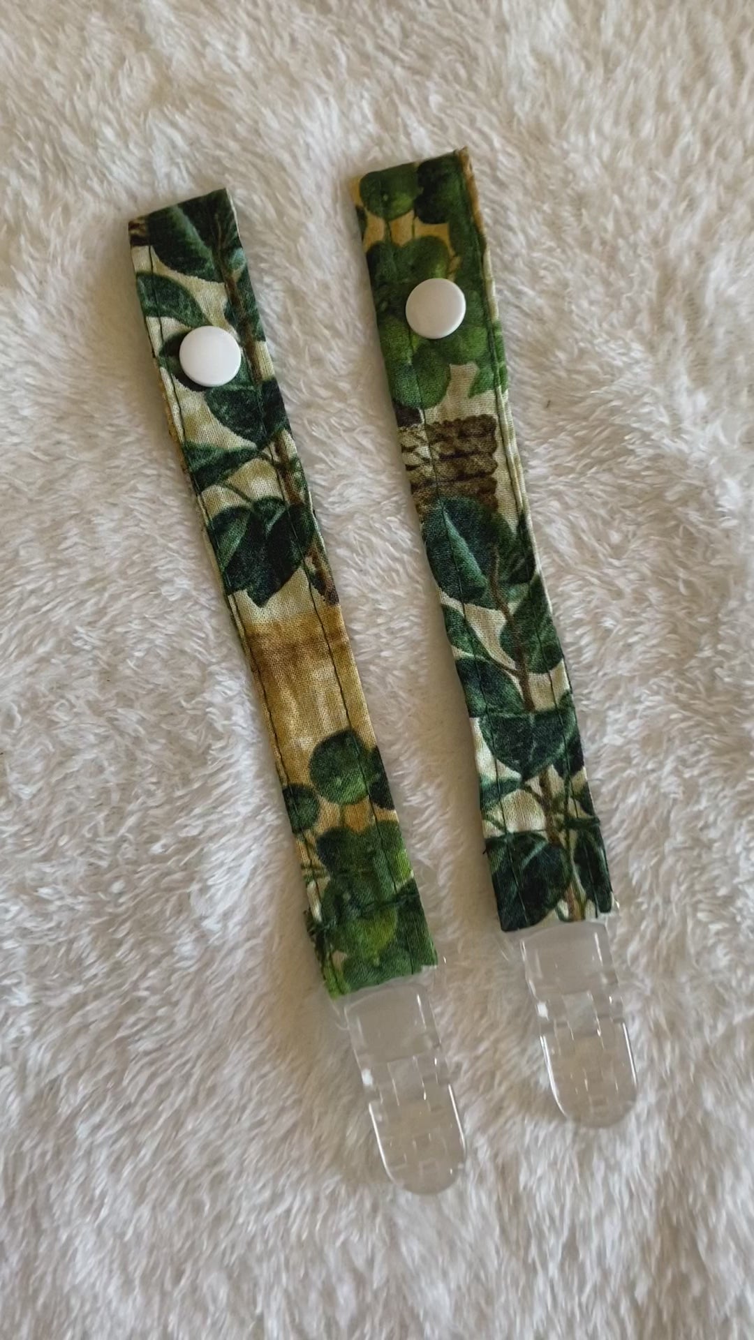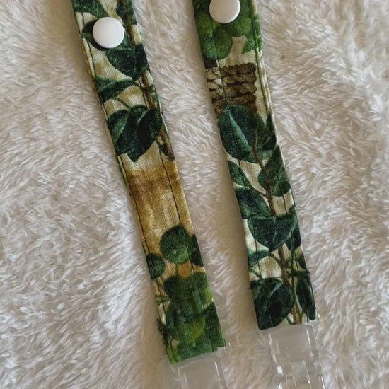 This beige and green leaf print cotton 8" length clip Works with Pacifiers of many different kinds and toys as well.